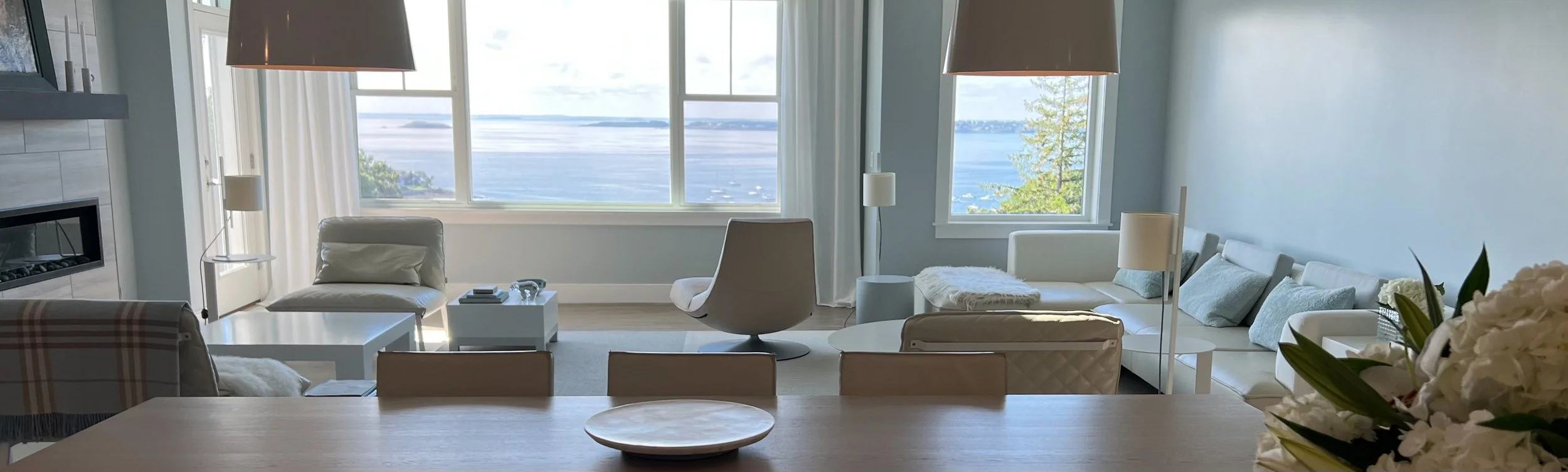 A gentle palette of blues and beige blend with the expansive ocean views.